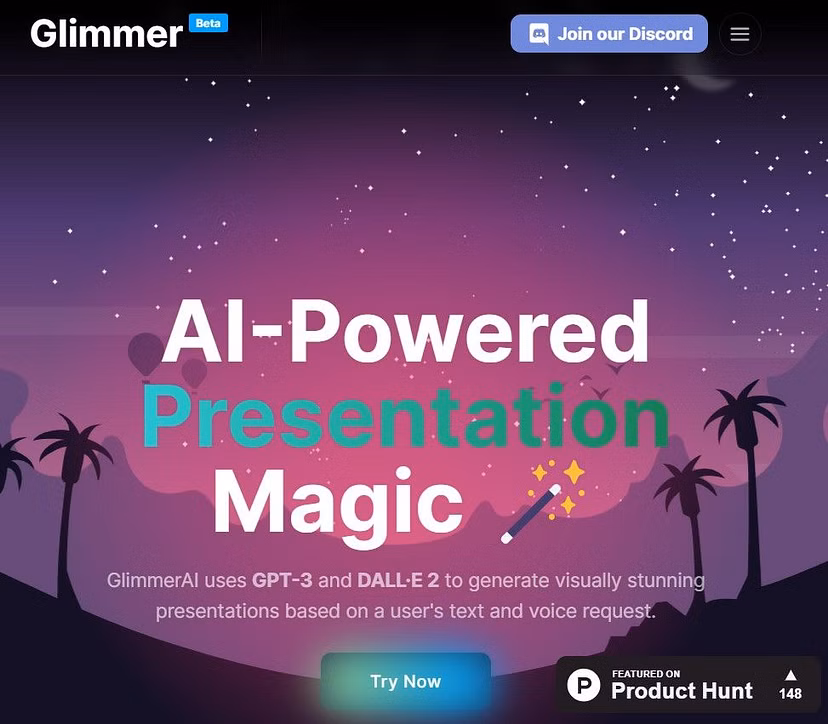 Generate professional-quality presentations using voice or text prompts. Glimmer is an AI-powered pitch deck generator that brings engaging visuals into your presentations, using GPT-3 and DALL-E 2. Simply describe what you need, customize the result, and export in your desired format.